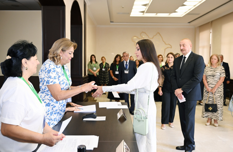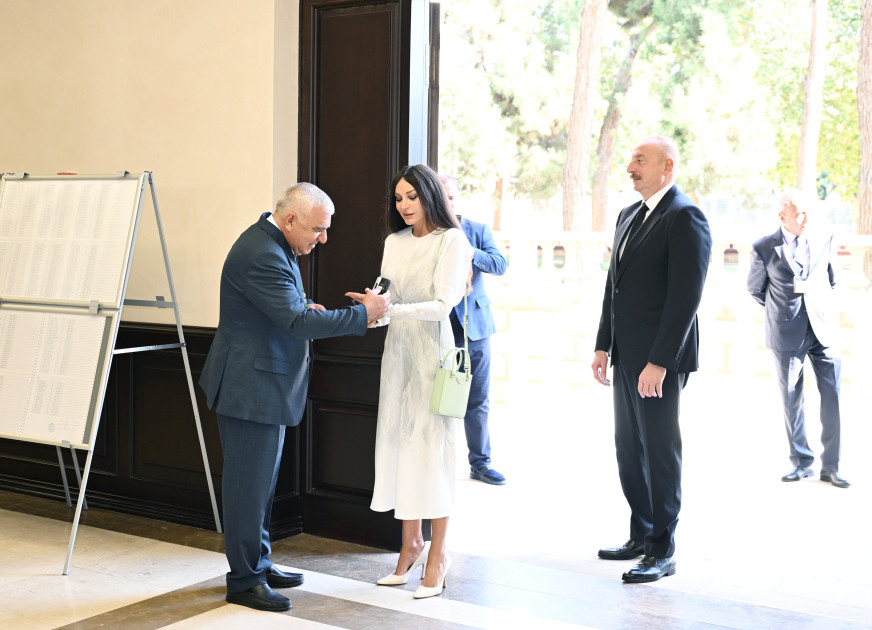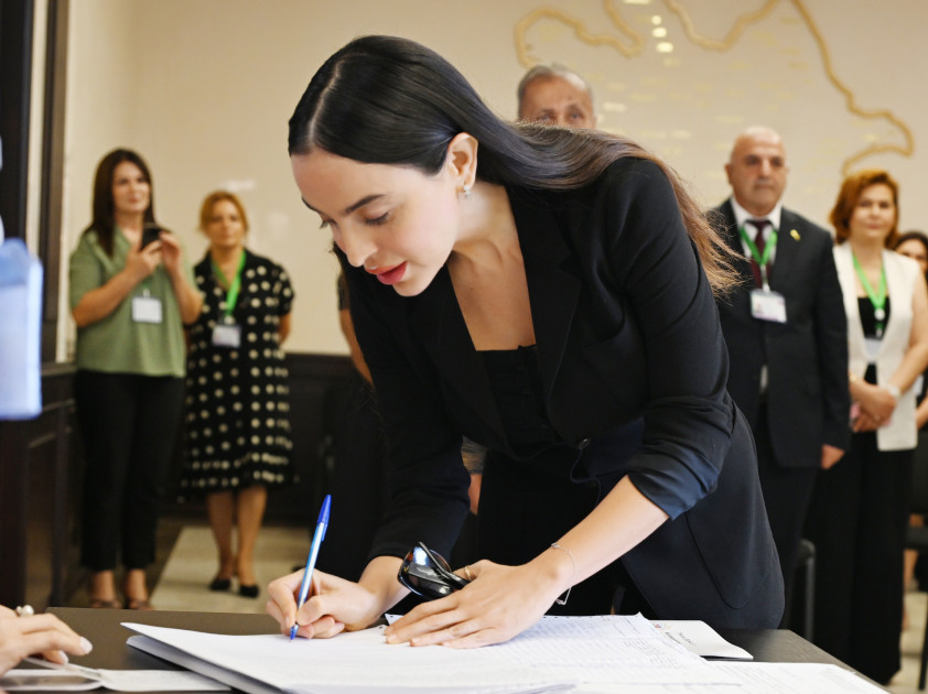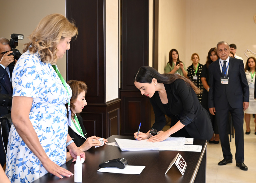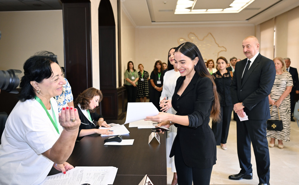 Sonra birinci xanım Mehriban Əliyeva və qızları Leyla Əliyeva səs verdilər.
