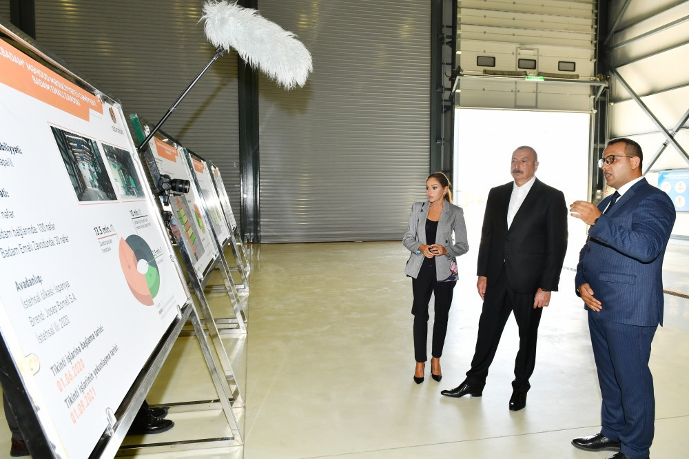 İqtisadiyyat naziri Mikayıl Cabbarov və “Azbadam” MMC-nin icraçı direktoru Anar Ağayev dövlət başçısına və birinci xanıma zavod barədə məlumat verdilər.