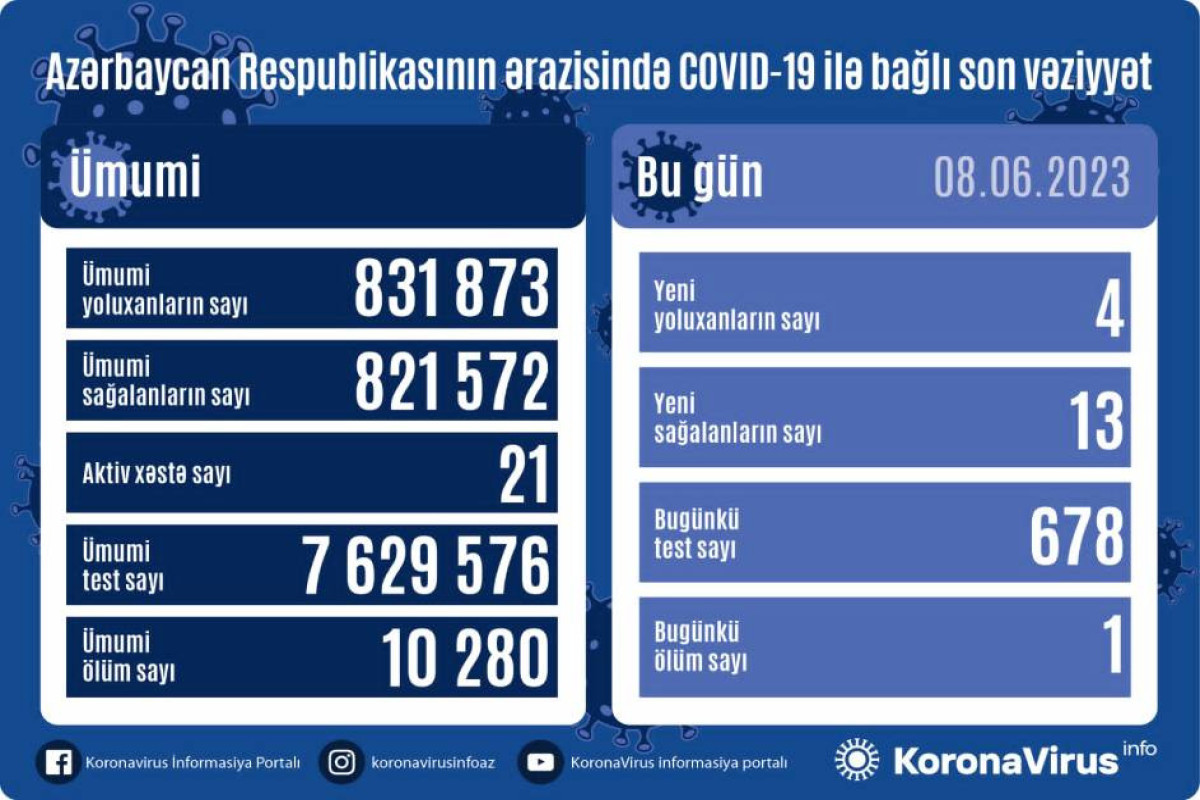 Azərbaycanda indiyədək ümumilikdə 831 873 nəfər koronavirus infeksiyasına yoluxub. Onlardan 821 572 nəfər müalicə olunaraq sağalıb, 10 280 nəfər vəfat edib, aktiv xəstə sayı 21 nəfərdir.