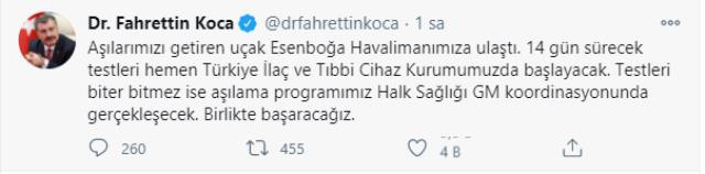 Peyvəndlərlə bağlı açıqlama verən Türkiyənin səhiyyə naziri Fahreddin Koca bildirib ki, 14 günlük test müddətindən sonra xoşagəlməz hal baş verməzsə, peyvəndləməyə start veriləcək.