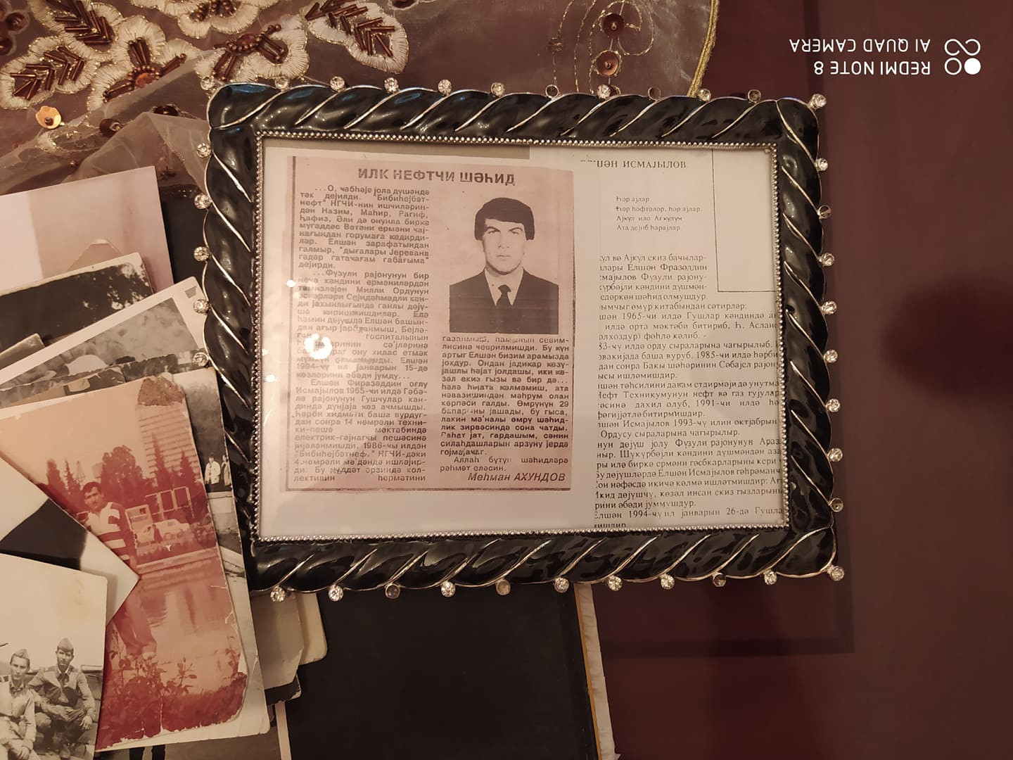 Elçin İsmayılov da Birinci Qarabağ müharibəsində həlak olmuş, özündən sonra bir oğlan, bir qız övladı, bir də cavan gəlin qoyub getmişdi. İndi döydüyüm qapını üzümə Elşənin həyat yoldaşı Səidə xanım açırdı. Telefonda vədələşdiyimiz kimi evdə bir özü, bir də oğlu idi. Doğrusu, söhbət edəcəyimiz otağa daxil olanda, divar boyu açılan mənzərəni görüb gözlərimə inanmadım. Elşənin şəhid olmasından 28 ildən çox vaxt keçsə də, qarşımda onun cürbəcür çərçivələrə salınmış şəkilləri, məktubları, bir də güldandakı təzə-tər qərənfillər məni əməlli-başlı təsirləndirmişdi. Ailə öz başçısını, sevən qadın yarını, övlad üzünü görmədiyi atasını unutmamışdı. Aradan keçən bu qədər illərə rəğmən...