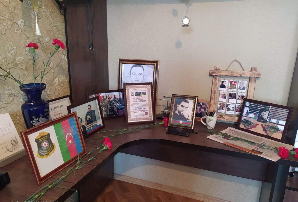 İndi Teymurun son dəfə yola salındığı həyətlərinə, mənzilinə getmək, onun təmasının enerjisini hələ də özündə daşıyan əşyalarına toxunmaq ağrılı idi. Dördüncü mərtəbəyə çatıb qapını döyəndə məni Teymurun atası Yavuz kişi qarşıladı. Bət-bənizi solmuş, saçları ağarmış, gözləri dolmuş şəhid atası. Evinin tək oğul övladı olan Teymur haqqında danışmaq, ürəyini boşaltmaq istəyi Yavuz bəyin gözlərindən oxunur. Teymurun şəkilləri, kitab və əşyaları olan otağa giririk. Üzərinə üç rəngli bayraq sərilən çarpayı bir zamanlar Teymurun uyuduğu çarpayıdır. Çarpayının üst tərəfində onun iki iri portreti asılıb. Hər fotodan şərqlilərə məxsus üz cizgiləri olan, dalğın baxışları bizə boylanan Teymur sanki dil açıb danışmaq istəyir. Şəhidimizin atası oğlunun barmaqlarını sıxa-sıxa həyəcanla söhbətə başlayır: