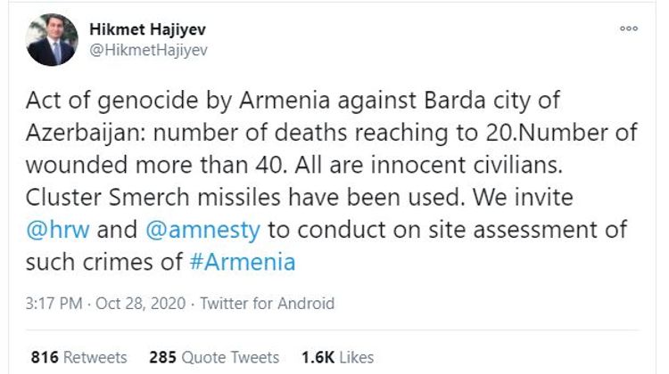 "Ermənistanın Azərbaycanın Bərdə şəhərinə qarşı soyqırımı aktı törədib. Ölənlərin sayı 20-yə çatıb, yaralıların sayı 40-dan çoxdur. Hamısı günahsız mülki şəxslərdir. Cinayətdə "Smerç" raketlərindən istifadə edilib. "Human Rights Watch" və "Amnesty İnternational"ı Ermənistanın bu cür cinayətlərinin yerində qiymətləndirilməsi üçün dəvət edirik".