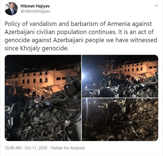 Azərbaycan prezidentinin köməkçisi Hikmət Hacıyev ermənilərin Gəncəyə raket zərbəsi endirməsinə münasibət bildirib.