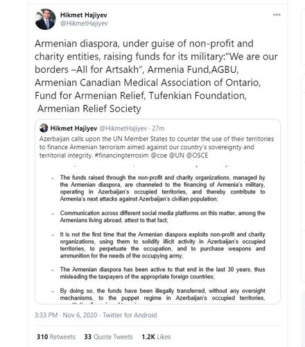"Erməni diasporası, qeyri-kommersiya və xeyriyyə qurumları adı altında hərbi qüvvələrinə vəsait toplayır".