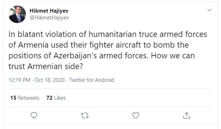 "Ermənistan silahlı qüvvələri humanitar atəşkəsi açıq şəkildə pozaraq döyüş təyyarələrindən Azərbaycan silahlı qüvvələrinin mövqelərini bombalamaq üçün istifadə etdilər. Ermənistan tərəfinə necə etibar edə bilərik?".