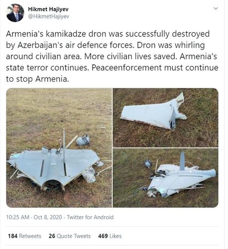 "Ermənistanın kamikadze dronu Azərbaycanın hava hücumundan müdafiə qüvvələri tərəfindən uğurla məhv edildi. Dron mülki ərazinin ətrafında fırlanırdı. Onun məhv edilməsi ilə mülki vətəndaşlarımızın həyatı xilas oldu. Ermənistanın mülki əhalimizə qarşı dövlət terroru davam edir. Beynəlxalq aləm Ermənistanın yaşayış məntəqələrimizi hədəfə almasını dayandırmağa davam etməlidir".