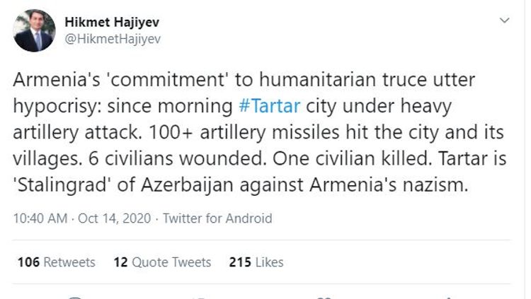 "Səhərdən etibarən Tərtər şəhəri ağır artilleriya hücumuna məruz qalıb. Şəhər və kəndlərə 100-dən çox top mərmisi düşüb. Nəticədə bir nəfər həlak olub, 6 mülki şəxs yaralanıb. Tərtər Ermənistanın nasizminə qarşı Azərbaycanın Stalinqradıdır".