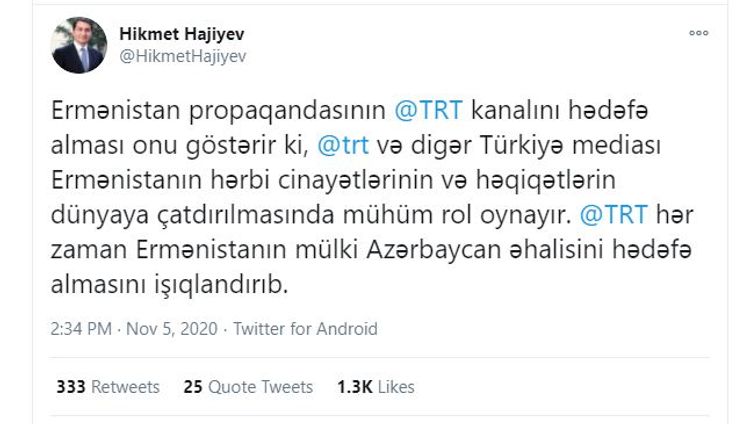 "Ermənistan propaqandasının "TRT" kanalını hədəfə alması onu göstərir ki, "TRT" və digər Türkiyə mediası Ermənistanın hərbi cinayətlərinin və həqiqətlərin dünyaya çatdırılmasında mühüm rol oynayır. "TRT" hər zaman Ermənistanın mülki Azərbaycan əhalisini hədəfə almasını işıqlandırıb".