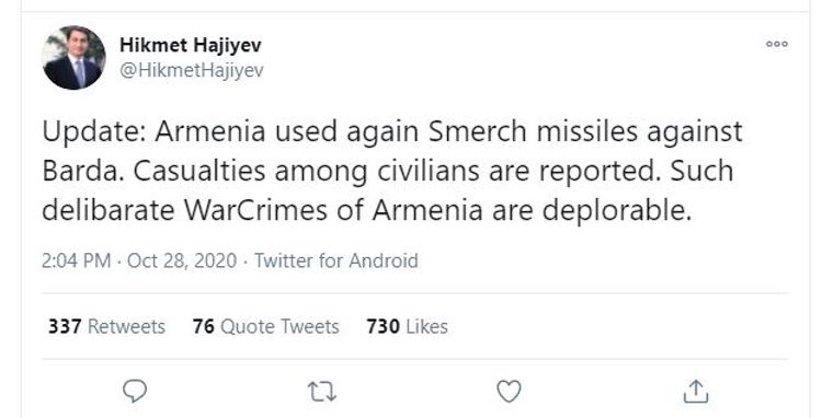 "Ermənistan Bərdəyə qarşı yenidən "Smerch" raketlərindən istifadə etdi. Mülki əhali arasında itkilər bildirilir. Ermənistanın belə müharibə cinayətləri acınacaqlıdır".