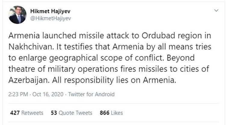"Ermənistan Naxçıvanın Ordubad bölgəsinə raket hücumu etdi. Bu, Ermənistanın bütün yollarla münaqişənin coğrafi əhatəsini genişləndirməyə çalışdığına dəlalət edir. Hərbi Əməliyyat Teatrının xaricində Azərbaycan şəhərlərinə raket atəşi açılır. Bütün məsuliyyət Ermənistanın üzərinə düşür".