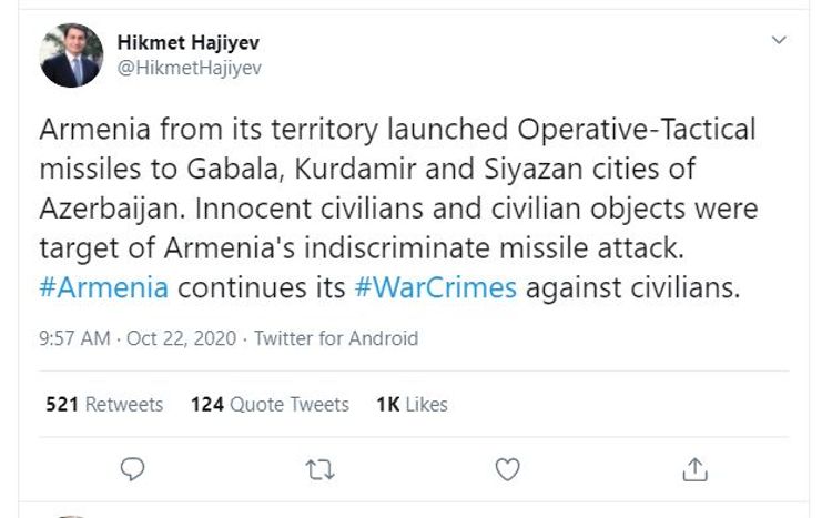 "Ermənistan öz ərazisindən Azərbaycanın Qəbələ, Kürdəmir və Siyəzən şəhərlərinə Operativ-Taktiki raketlər atıb. Günahsız mülki əhali və mülki obyektlər Ermənistanın ayrı-seçkiliksiz raket hücumunun hədəfi idi. Ermənistan mülki şəxslərə qarşı müharibə cinayətlərini davam etdirir".