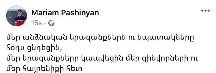 Ermənistanın baş naziri Nikol Paşinyanın qızı Maryam Paşinyan Dağlıq Qarabağdakı döyüşlərlə bağlı paylaşım edib.