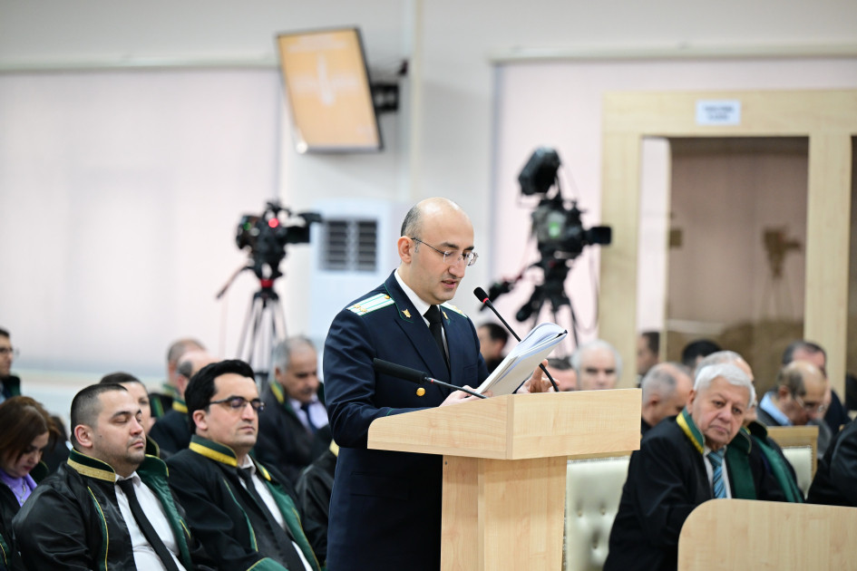 Baş prokurorun xüsusi tapşırıqlar üzrə köməkçisi Tuqay Rəhimli ittihamın təcavüzkar müharibənin gedişində əhalinin məhv edilməsi faktlarına dair hissəsinin elanına başlayıb.