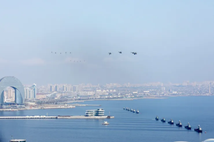 Paradda, həmçinin Xəzər dənizində döyüş gəmiləri və katerlər də nümayiş etdirilib. Bu, Azərbaycanın region sularında suverenlik və strateji nəzarət qabiliyyətinin sarsılmaz gücünü göstərir.