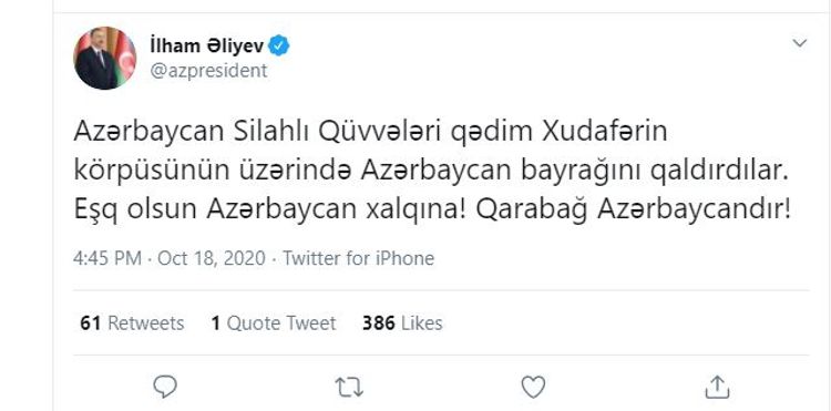 "Azərbaycan Silahlı Qüvvələri qədim Xudafərin körpüsünün üzərində Azərbaycan bayrağını qaldırdılar. Eşq olsun Azərbaycan xalqına! Qarabağ Azərbaycandır!".