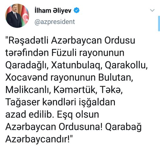 "Rəşadətli Azərbaycan Ordusu tərəfindən Füzuli rayonunun Qaradağlı, Xatunbulaq, Qarakollu, Xocavənd rayonunun Bulutan, Məlikcanlı, Kəmərtük, Təkə, Tağaser kəndləri işğaldan azad edilib. Eşq olsun Azərbaycan Ordusuna! Qarabağ Azərbaycandır!"