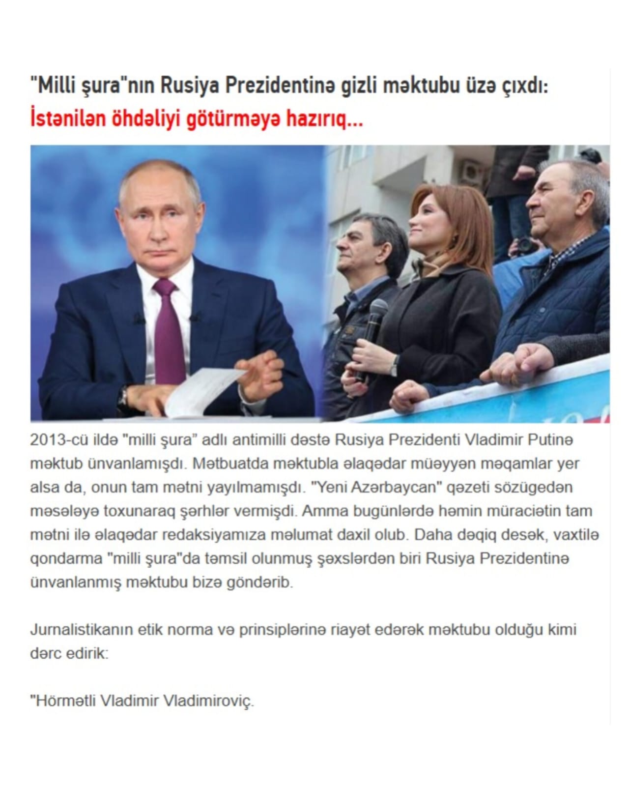 Ramiz Mehdiyevin Rusiyaya yazdığı xəyanət məktubunun oxşarını 2013-cü ildə Əli Kərimli və dəstəsi də yazmışdı. 2013-cü ildə “Milli Şura” adlı antimilli qurum Rusiya Prezidenti Vladimir Putinə məktub yazaraq ondan dəstək istəmişdi. Hətta onlar hakimiyyətə gələcəkləri təqdirdə istənilən öhdəliyi götürməyə hazır olduqlarını da bəyan etmişdilər. DTX-nın yaydığı material və orada əks olunan Qənimət Zahidin səs yazısı da 2013-cü ildəki öhdəliyin təkrarlandığını sübut edir. Bu faktlar göstərir ki, Ramiz Mehdiyev xəyanətinin təməli hələ o zamandan qoyulub.