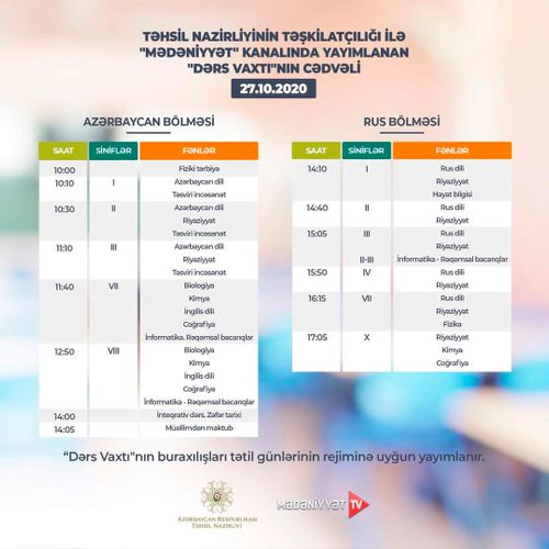 Lent.az məlumat verir ki, Təhsil Nazirliyi dərs cədvəlinə diqqət yetirməyi, mövzuları “Dərs vaxtı”nda öyrənməyi tövsiyə edir.