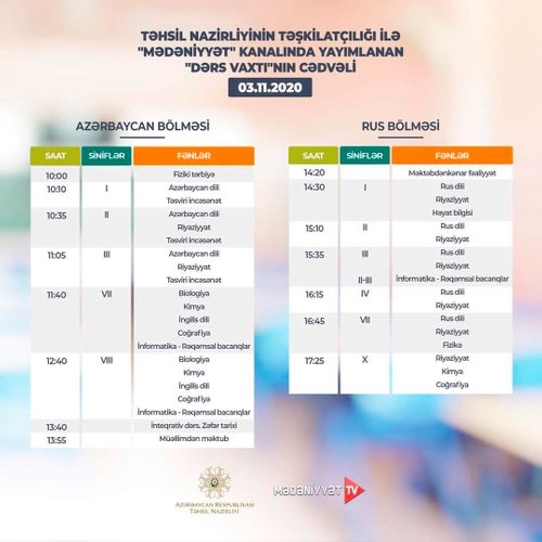Lent.az məlumat verir ki, Təhsil Nazirliyi dərs cədvəlinə diqqət yetirməyi, mövzuları “Dərs vaxtı”nda öyrənməyi tövsiyə edir.
