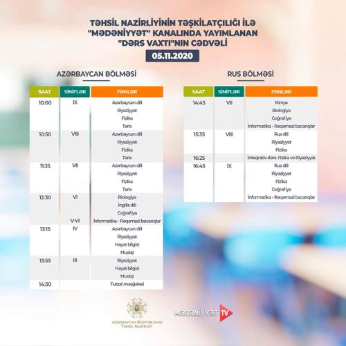 Lent.az məlumat verir ki, Təhsil Nazirliyi dərs cədvəlinə diqqət yetirməyi, mövzuları “Dərs vaxtı”nda öyrənməyi tövsiyə edir.