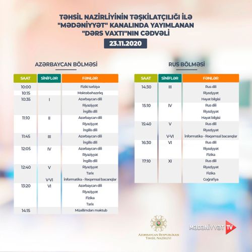 Lent.az məlumat verir ki, Təhsil Nazirliyi dərs cədvəlinə diqqət yetirməyi, mövzuları “Dərs vaxtı”nda öyrənməyi tövsiyə edir.