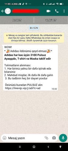 Azərbaycan Nəqliyyat, Rabitə və Yüksək Texnologiyalar Nazirliyi (NRYTN) vətəndaşları “WhatsApp” üzərindən məşhur şirkətlərin adından həyata keçirilən fişinq kampaniyaları barədə xəbərdar edir. Kiberdələduzlar istifadəçiləri “tələ”yə salmaq məqsədilə onlara “WhatsApp” üzərindən “Adidas” və digər məşhur şirkətlərin adından “spam” mesajlar göndərərək həmin şirkətlərin yubileyi münasibətilə pulsuz məhsulların paylandığını bildirirlər.
