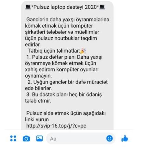 Qurumdan Lent.az-a verilən məlumata görə, kiberdələduzlar tərəfindən həyata keçirilən növbəti “fişinq” kampaniyasının hədəfi müəllim və tələbələrdir. Belə ki, “WhatsApp” üzərindən “Pulsuz laptop dəstəyi 2020” başlığı ilə göndərilən “spam” mesajlarda guya kompüter şirkətləri tərəfindən müəllim və tələbələrə pulsuz noutbukların təqdim edildiyi bildirilir.