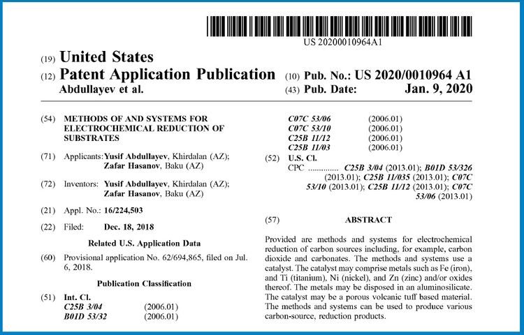 Universitetdən Lent.az-a verilən məlumata görə, alimin “Əvəzedicilərin elektrokimyəvi reduksiyası üçün metodlar və sistemlər” adlı ixtirasına yanvarın 9-da ABŞ-ın Patent və Əmtəə Nişanları Ofisi tərəfindən US 2020/0010964A1 nömrəli patent verilib.