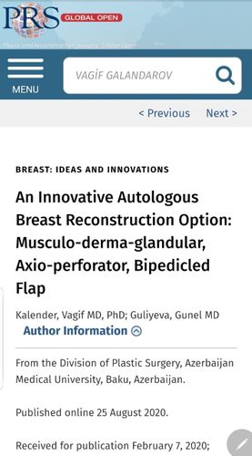 Professor Vaqif Qələndərin məqaləsində "Musculo-derma-glandular,Axii-perforator,Biprdicled Flap" adlandırılan yeni cərrahi yanaşma metodikası təqdim olunur.