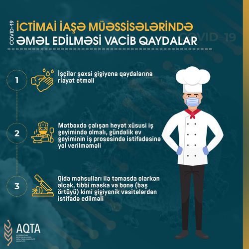 Nazirlər Kabinetinin müvafiq qərarına əsasən, qida qəbulu zallarında oturacaqların ara məsafəsi eyni masa arxasında 1 metrdən, masalararası məsafə isə 2 metrdən az olmamalıdır. Koronavirus (COVID-19) pandemiyası dövründə ictimai iaşə müəssisələrində müştəri qəbulu qüvvədə olan norma və qaydalardan 2 dəfə az olmalı və müvafiq olaraq, adambaşına müəyyən edilən sahə ikiqat artırılmalıdır.