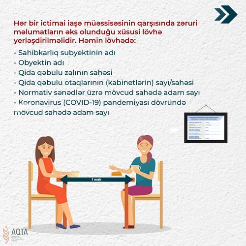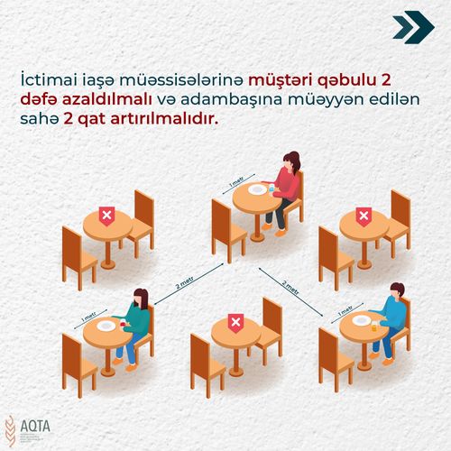 AQTA-dan Lent.az-a verilən məlumata görə, bununla əlaqədar müvafiq qanunvericiliyə əsasən açıq havada fəaliyyət göstərən ictimai iaşə müəssisələrində müştəri qəbulu qüvvədə olan norma və qaydalardan 2 dəfə az olmalı və müvafiq olaraq hər adambaşına müəyyən edilən sahə ikiqat artırılmalıdır. Qida qəbulu zallarında oturacaqların ara məsafəsi eyni masa arxasında 1 metrdən, masalararası məsafə isə 2 metrdən az olmamalıdır.