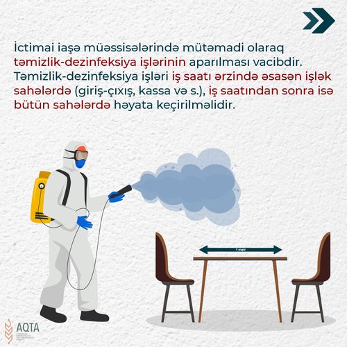 Xəstəliyə yoluxma riskini azaltmaq üçün ictimai yerlərdə ortaq istifadə edilən səthlərin mütəmadi təmizlənməsi və dezinfeksiya edilməsi zəruridir. Təmizlik-dezinfeksiya işləri iş saatı ərzində əsasən işlək sahələrdə (giriş-çıxış, kassa və s.), iş saatından sonra isə bütün sahələrdə həyata keçirilməlidir. Sanitar gigiyenik qaydalara əsasən, ictimai iaşə müəssisələrində sanitar məişət otaqlarının (sanitar qovşaq, soyunub-geyinmə otağı və s.) işlək və təmiz vəziyyətdə saxlanmalı, axar isti və soyuq su təchizatı təmin edilməlidir. Hər bir müəssisənin təmizlik vasitələri və dezinfeksiyaedici maddələrlə daimi olaraq təmin edilməsi şərtdir.