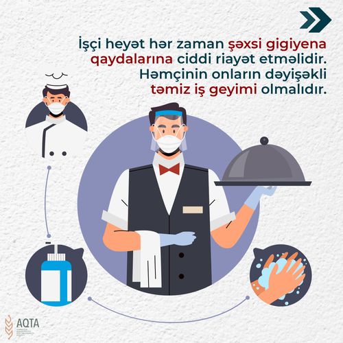 “İctimai iaşə müəssisələrində koronavirus infeksiyasının (COVID-19) profilaktikasına dair metodiki göstərişlər”də müəssisə daxilində işçi heyətin şəxsi gigiyena qaydalarına əməl etməsi, yeməklər hazırlanarkən termiki emala riayət edilməsi, o cümlədən xam məhsulların istifadədən əvvəl təmizlənməsi, yemək dəstlərinin, mətbəx avadanlıqlarının, çirkli səthlərin mütəmadi olaraq yuyulub təmizlənməsi tövsiyə olunur.
