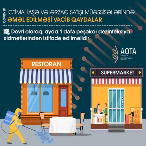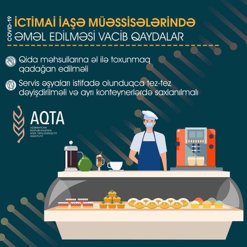 Bu barədə Lent.az-a Azərbaycan Qida Təhlükəsizliyi Agentliyindən məlumat verilib. Bildirilib ki, kafe-restoranlarda, mehmanxanaların və təhsil müəssisələrinin nəzdindəki ictimai iaşə sahəsində əhalinin sağlamlığının qorunması və təhlükəsizliyinin təmin edilməsi məqsədilə sanitariya-gigiyena və karantin qaydalarının tələblərinə ciddi əməl edilməlidir.