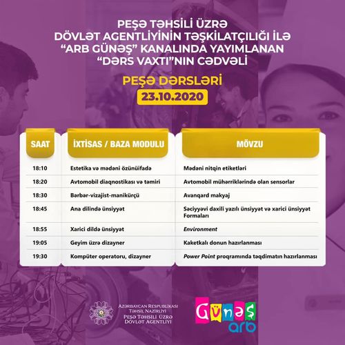 Oktyabrın 23-ü üçün nəzərdə tutulan peşə teledərsləri saat 18:10-da yayımlanacaq.