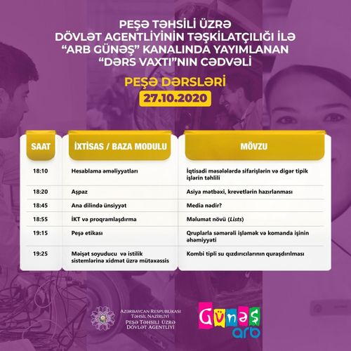 Oktyabrın 27-si üçün nəzərdə tutulan peşə teledərsləri saat 18:10-da yayımlanacaq.