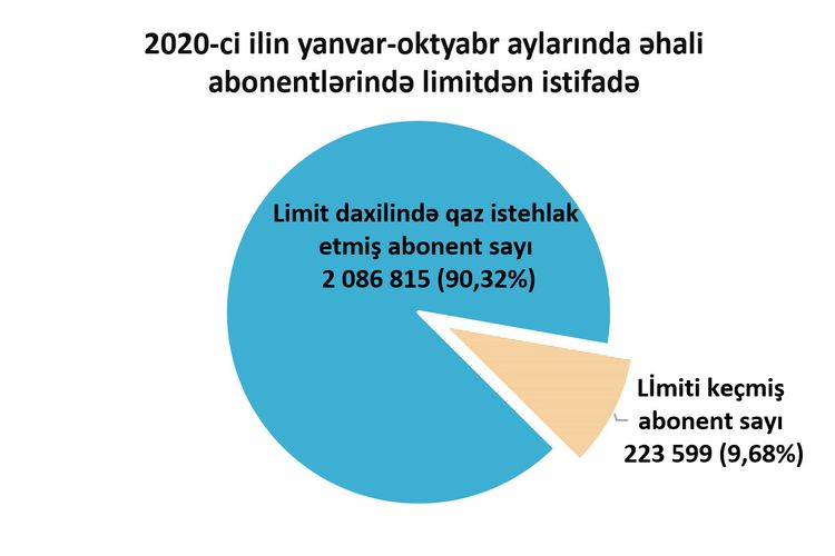 Qurumdan Lent.az-a verilən məlumata görə, qeydiyyatda olan 2 milyon 310 min 414 əhali abonentinin cəmi 9,68 faizi illik hər kubu 10 qəpikdən satılan 2 200 kubmetrlik güzəştli limit həddini keçib. Bu da say etibarı ilə 223 599 abonent deməkdir. Yerdə qalan 2 milyon 086 min 815 abonent (ümumi əhali abonentlərinin 90,32 %) qazdan güzəştli limit daxilində istifadə edib.