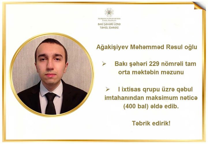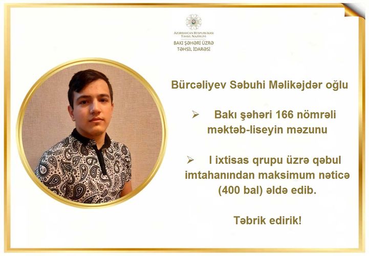 BŞTİ-dən Lent.az-a verilən məlumata görə, 20-21 avqust tarixlərində keçirilmiş qəbul imtahanlarının (XI sinif üzrə) nəticələrinə əsasən, BŞTİ-nin tabeliyindəki 114 nömrəli tam orta məktəbin məzunu Əliyev Həsənbala Fuad oğlu, 166 nömrəli məktəb-liseyin məzunu Bürcəliyev Səbuhi Məlikəjdər oğlu, 229 nömrəli tam orta məktəbin məzunu Ağakişiyev Məhəmməd Rəsul oğlu, 284 nömrəli tam orta məktəbin məzunu Nəbiyev Oktay Sübhi oğlu və 311 nömrəli tam orta məktəbin məzunu Hüseynov Səbuhi Ramiq oğlu 400 bal toplayıblar. Qeyd edək ki, bu mərhələdə toplanıla biləcək maksimal bal 400 baldır.