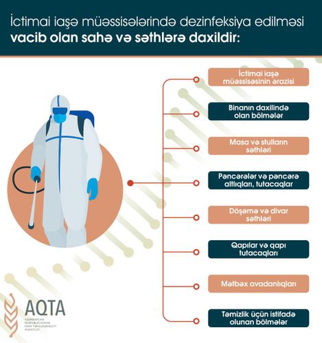 • Bu cür məkanlarda mütəmadi dezinfeksiya işləri aparılmalı, hər bir masada dezinfeksiyaedici məhlulların yerləşdirilməsi təmin olunmalıdır. Qida qəbulu zallarında, otaqlarda və açıq məkanlarda sərinkeşlərdən (ventilyatorlardan) istifadə olunmamalı, təmizlik-dezinfeksiya işləri iş saatı ərzində əsasən işlək sahələrdə (giriş-çıxış, kassa və s.), iş saatından sonra isə bütün sahələrdə həyata keçirilməlidir.