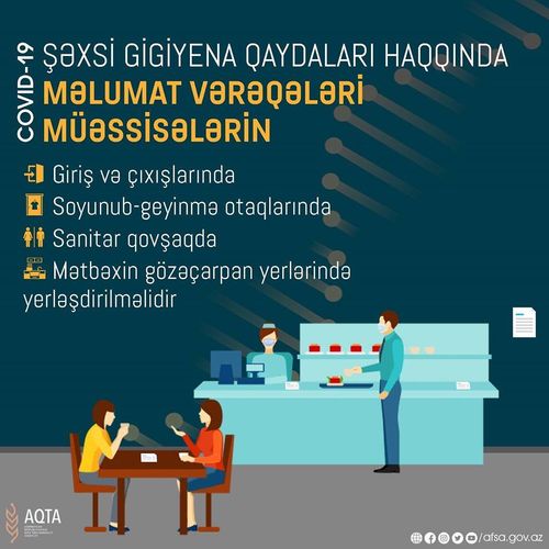 • Hər bir şəxs ictimai iaşə müəssisələrinə daxil olarkən pandemiya şəraitinin tələblərinə mütləq əməl etməli, eyni zamanda həmin müəssisədə bu qaydalara əməl olunması üçün ictimai nəzarətin təmin olunmasında iştirak etməlidir.