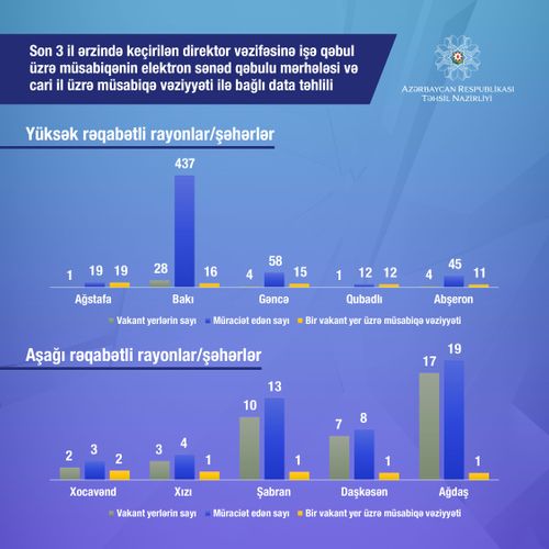 2020-ci il üzrə elan olunan müsabiqə zamanı vakansiya və müraciət edən namizəd sayına nisbətdə ən yüksək rəqabətli rayon Ağstafa rayonudur. Bu rayon üzrə 1 vakant direktor vəzifəsinə 19 namizəd müraciət edib. Ən aşağı rəqabətli rayonlar isə Xocavənd, Xızı, Şabran, Daşkəsən və Ağdaş rayonlarıdır.
