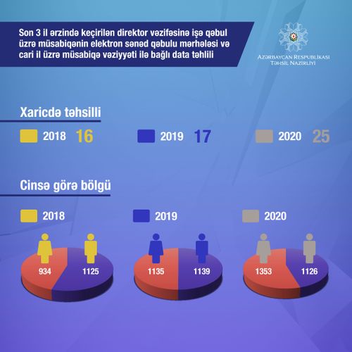 Ümumi təhsil müəssisələrinə direktor vəzifəsinə işə qəbul üzrə müsabiqənin elektron sənəd qəbulu mərhələsində 2018-ci il üzrə 2 059 namizəd, 2019-cu il üzrə 2 274 namizəd, 2020-ci il üzrə 2 479 namizəd iştirakını təsdiq edib.