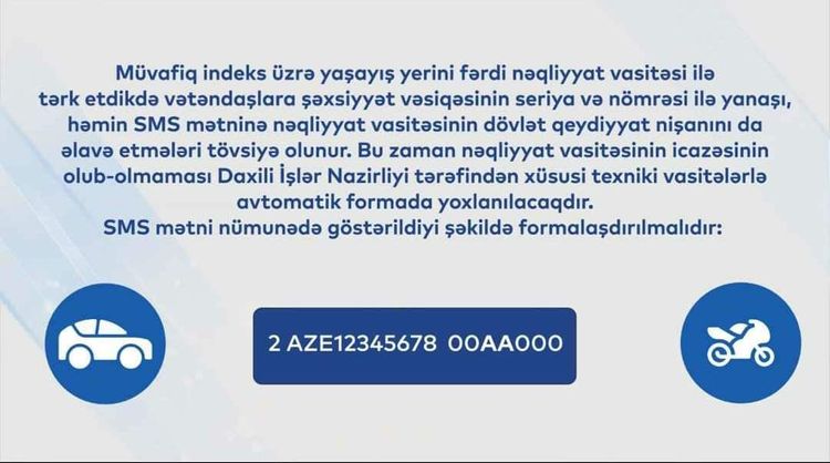 Lent.az xəbər verir ki, müvafiq indeks üzrə yaşayış yerini fərdi nəqliyyat vasitəsilə tərk edərkən, SMS nömrəsinə şəxsiyyət vəsiqəsinin seriya və nömrəsindən əlavə, maşının dövlət qeydiyyat nişanının da yazılması tövsiyə olunur.