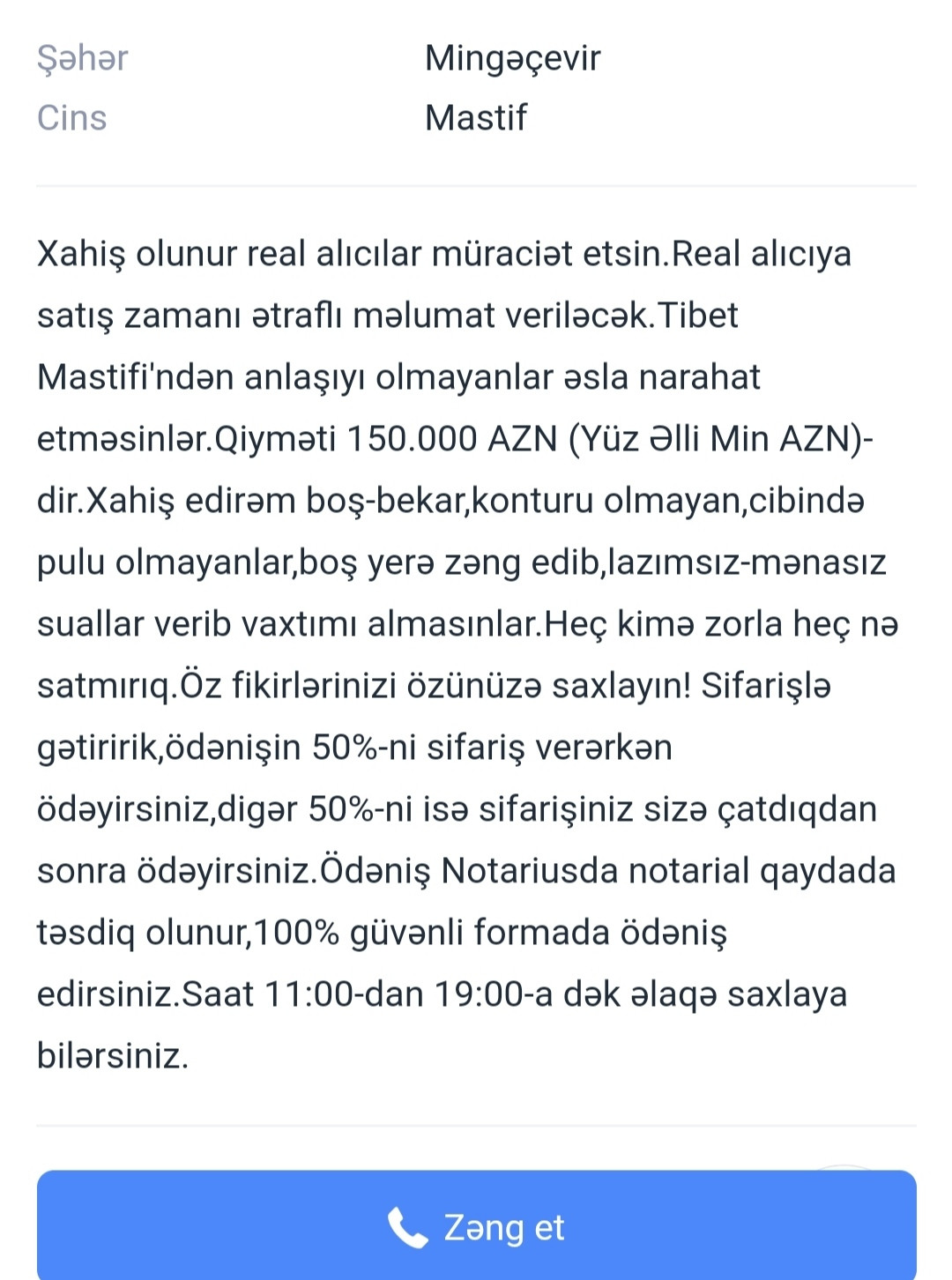 Mingəçevir sakini "Tibet mastivi" cinsindən olan itini nə az, nə çox 150 min manata təklif edib.