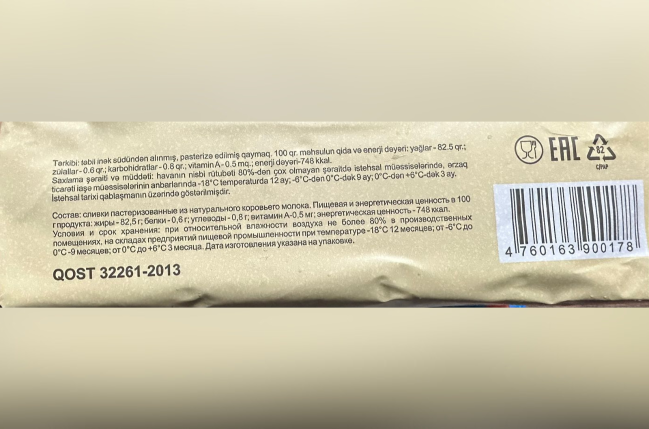 Qeyd edək ki, aşkarlanan uyğunsuzluqlar qida məhsulunun təhlükəsizlik göstəriciləri ilə bağlı olmasa da, istehsalçı tərəfindən qanunvericiliyə zidd şəkildə istehlakçıların aldadılması və hüquqlarının pozulması hesab olunur. Belə ki, kərə yağı məhsullarının üzərində təbii inək südündən alınmış, pasterizə edilmiş qaymaqdan istifadə edilməsi bəyan edilsə də, yoxlama zamanı məhsulun faktiki tərkibinə bitki yağının qatılması halı aşkar edilib.