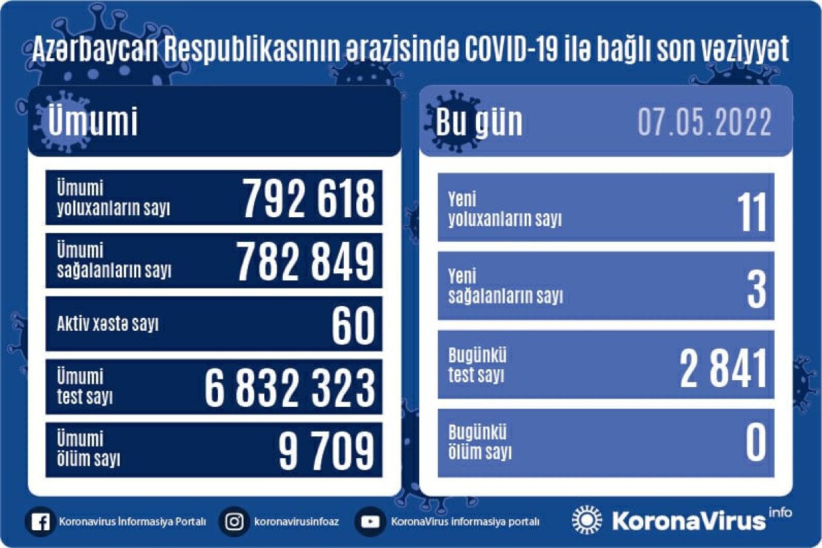 Azərbaycan Respublikasında koronavirus (COVID-19) infeksiyasına 11 yeni yoluxma faktı qeydə alınıb, 3 nəfər müalicə olunaraq sağalıb.