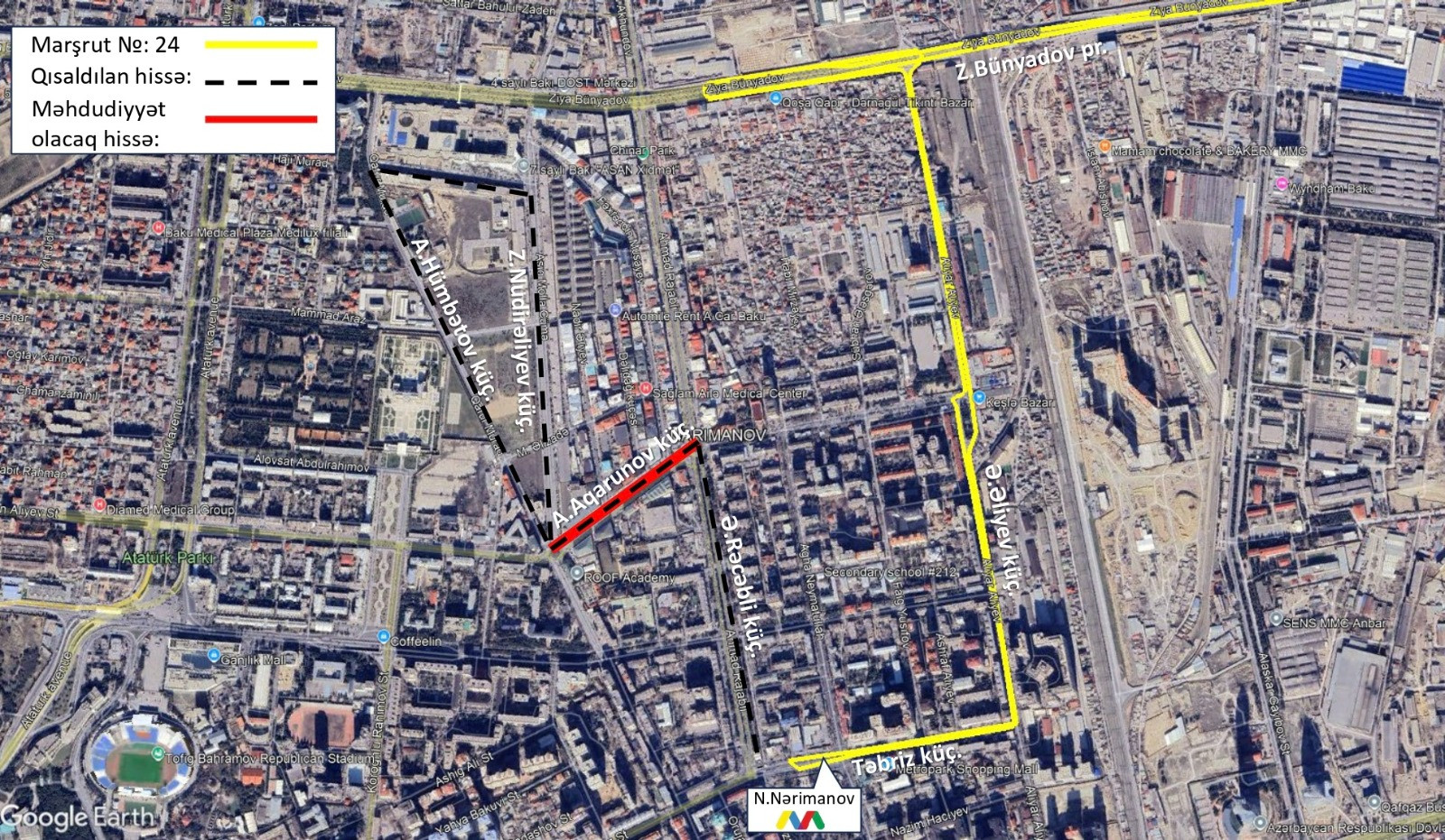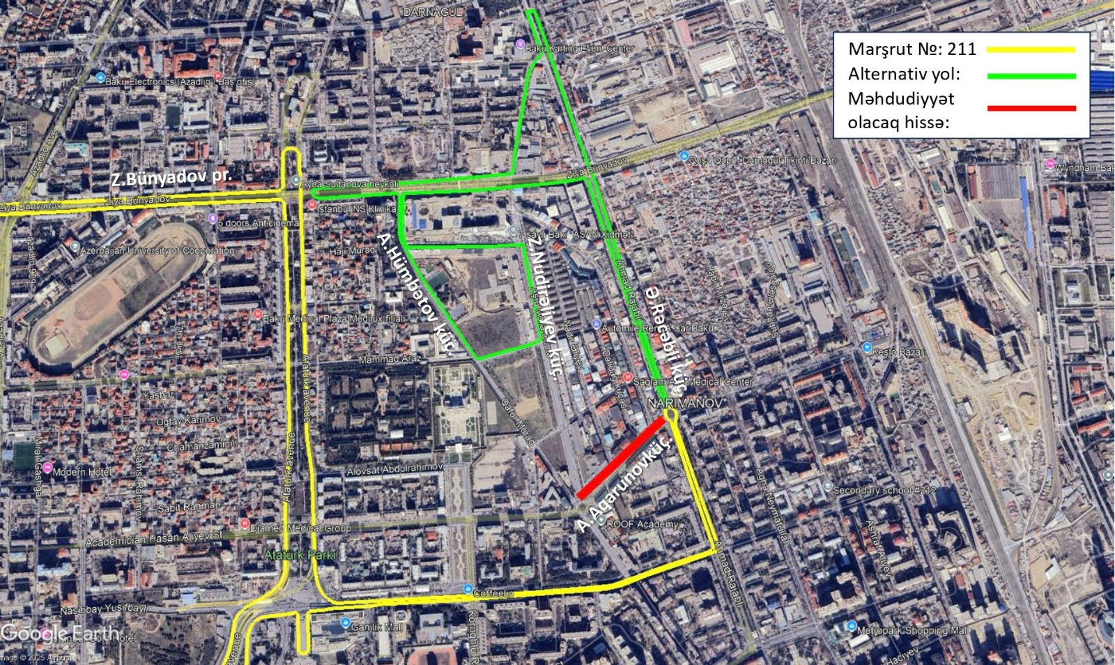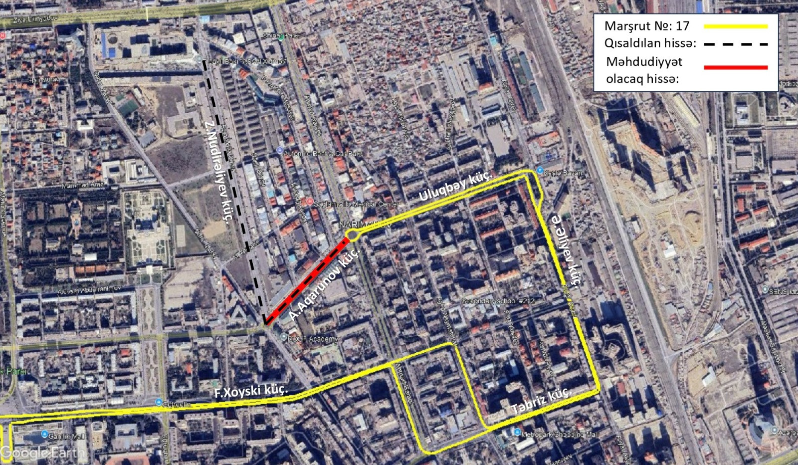 Azərbaycan Yerüstü Nəqliyyat Agentliyindən Lent.az-a verilən xəbərə görə, məhdudiyyətlə əlaqədar 17, 24 və 211 nömrəli marşrutların hərəkət sxemi müvəqqəti dəyişdiriləcək.