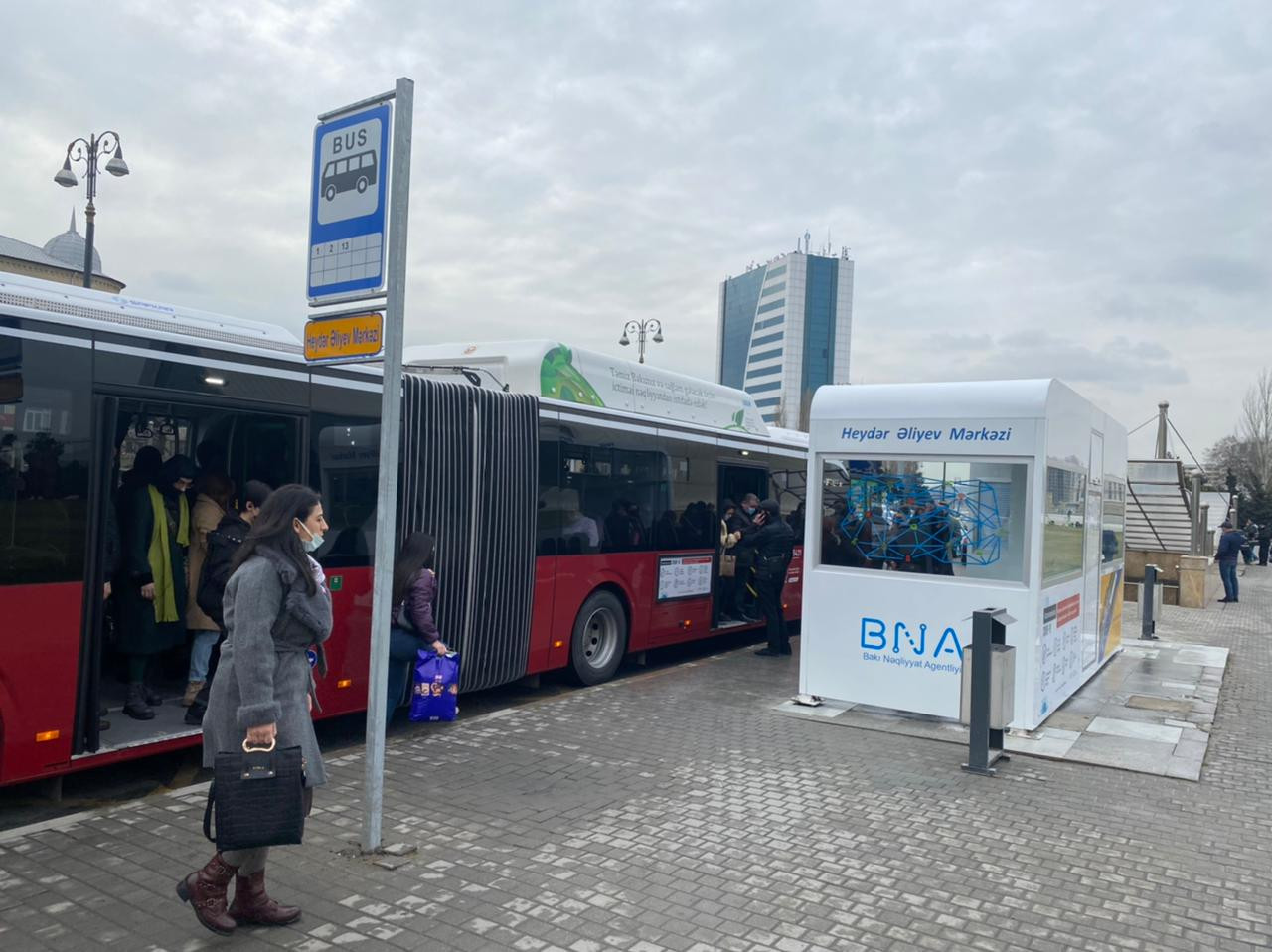 Bakı Nəqliyyat Agentliyindən Lent.az-a verilən məlumata görə, bu çərçivədə Bakı şəhərində bio-smart avtobus dayanacaq pavilyonlarının quraşdırılmasına başlanılıb. İlk belə dayanacaq pavilyonu Heydər Əliyev Mərkəzinin yaxınlığında quraşdırılıb. Ərazinin memarlıq üslubu ilə həmahəng olan pavilyon Heydər Əliyev prospektində, şəhər mərkəzi istiqamətində yerləşir. Bu dayanacaqdan 1, 2 və 13 nömrəli müntəzəm marşrut xətti üzrə avtobuslar keçir. Sərnişin axını baxımından əsas cəlbetmə məntəqələrindən hesab olunur.