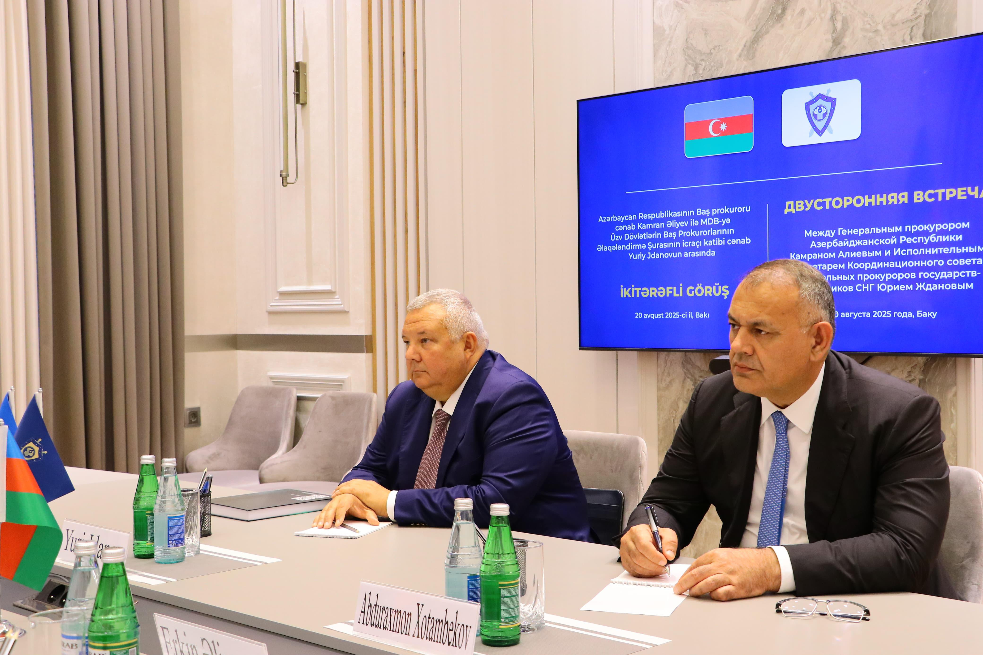 Görüş çərçivəsində MDB-yə üzv dövlətlərin Baş Prokurorlarının Əlaqələndirmə Şurasının yaradılmasının 30 illiyi münasibətilə yubiley tədbirlərinin təşkili və cari ilin oktyabr ayında Tacikistanda keçiriləcək Şuranın 35-ci iclasına hazırlıq məsələləri müzakirə edilib.
